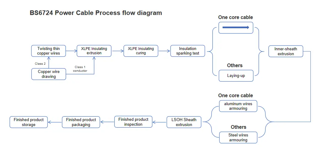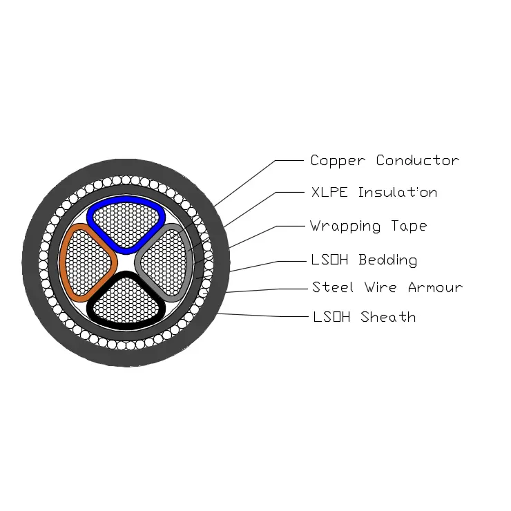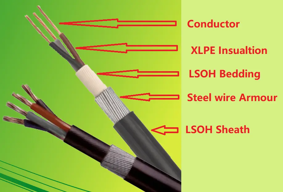 BS 6724 -virtakaapeli koostuu T1R-kuparijohtimesta, XLPE-eristyksestä, PVC-peitteestä, teräspatopanssarista ja LSOH-vaipasta.