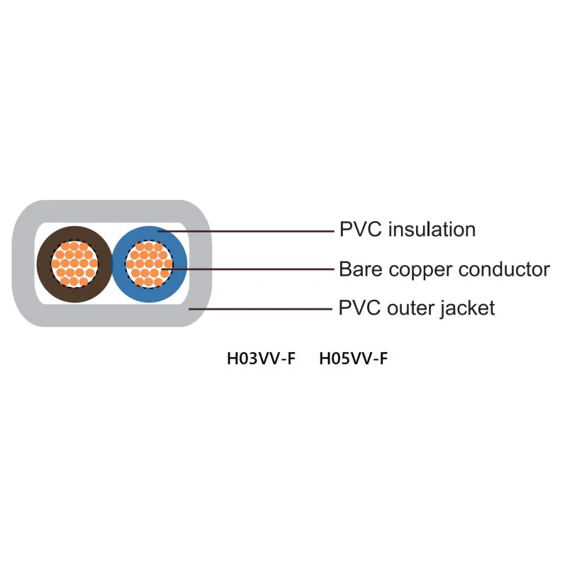 H05VV-F, H05VVH2-F, H03VV-F, H03VVH2-F koostuu luokan 5 hienoista kuparijohtimista, lyijyttömästä PVC-eristyksestä ja vaipasta.